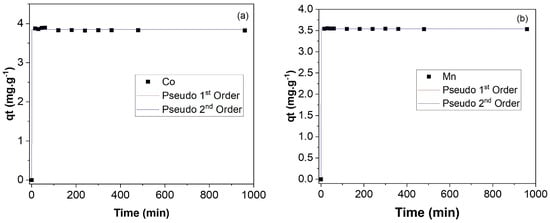 Pseudo-first and -second order models for Co2+ (a) and Mn2+ (b) adsorption. Concentrations: 10 mg L−1 of metallic ions and a 1.0 g L−1 dosage of FAU:MgFe2O4.
