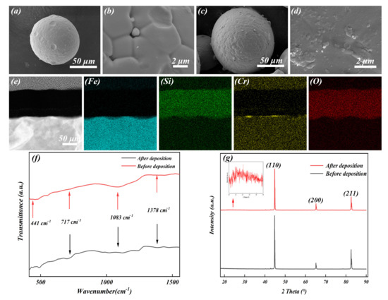 SEM images of Fe–Si–Cr powders prior to (a,b) and after deposition (c,d); EDS spectra (e), FTIR spectra (f), and XRD patterns (g).
