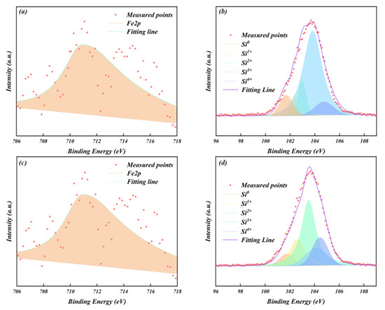 Changes in Fe-Si-Cr materials before and after CVD were confirmed by XPS analysis, the results of which are shown in Figure 2a–d. The peak positions and atomic ratios were determined through curve fitting. To correct the positions of the other peaks, the electron binding energy of the C1s peak was established at 284.8 eV. Before CVD, the Fe-Si-Cr substrate showed a Fe 2p peak at 710.8 eV (21.38 at%) (Figure 5a), which corresponded to Fe0 [14]. The Fe 2p3/2 level in the Fe-Si-Cr material exhibited a slightly higher binding energy compared to that anticipated for pure iron, which could be ascribed to the interactions between silicon and chromium [15]. The Si 2p spectrum exhibited multiple peaks that corresponded to various chemical species, including Si0, sub-oxides (Si1+, Si2+, and Si3+), and SiO2 (Si4+). Specifically, the peaks observed at 101.67 eV (6.59 at%) correspond to Si0, while those at 102.32 eV (6.98 at%), 102.92 eV (10.46 at%), 103.82 eV (63.73 at%), and 104.75 eV (9.19 at%) correspond to Si1+, Si2+, Si3+, and Si4+, respectively. Following the deposition process, the position and fitting outcome remained unchanged. Moreover, the five peaks that corresponded to Si exhibited comparable binding energies: Si0 (101.75 eV, 6.59 at%), Si1+ (102.63 eV, 16.69 at%), Si2+ (103.53 eV, 45.31 at%), Si3+ (104.16 eV, 14.76 at%), and Si4+ (104.45 eV, 16.65 at%). The observed decreases in Si0 (31.64%), Si3+ (76.84%), and a rise in Si4+ (44.80%) could be attributed to the production of SiO2 particles during the CVD process [16]. The results of the XPS analysis confirmed the successful deposition of SiO2 on Fe–Si–Cr powders.