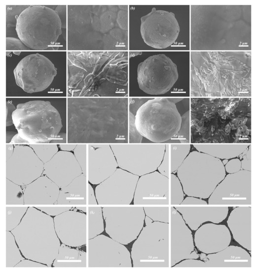 Figure 3a–f shows the surface morphologies of composite powders coated with different weight percentages of SS. These findings indicate that the coating process led to a significant reduction in the number of original pits that were present on the surface of the powder. At low coating concentrations, the clusters detected in the nearest region of the sample powder surface gradually covered the entire powder particles to compensate for the pores which were formed during the CVD process, where SiO2 was not attached. With a gradual increase in the SS coating concentration (3~4 wt%), the micron clusters became denser, ultimately resulting in the formation of a film on the surface of the sample. However, the uniformity and compactness of the insulating layers were negatively impacted by a continuous increase in the coating concentration due to the agglomeration of the external matter on the surface; the density changes are shown in Table 1. Figure 2g–l depicts the backscattered electron (BSE) imaging of the Fe-Si-Cr-based SMCs with a smooth surface. The non-uniformity of the insulating layer was noted to occur when the concentration of SS was within the range of 1–2 wt%, with a tendency for convergence at the particle junction. The incomplete SS insulating layer underwent agglomeration due to the high pressure generated during the pressing process. As the concentration of SS increased, the coating achieved greater uniformity. However, the high SS concentration led to a recurrence in the agglomeration of outside material on the particle surface. Therefore, an SS concentration of 4–5 wt% led to the production of complete SMCs with double layers.