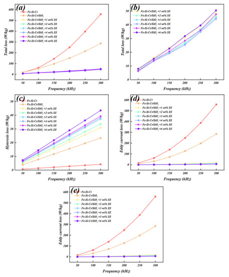 Core loss can be defined as the power absorbed by the magnetic core in an applied alternating (AC) field, that is, the dissipation of the magnetic core in response to an AC magnetic field. The power in these losses is mostly turned into heat energy, which increases the temperature of the magnetic core, reduces the working efficiency, and even damages the insulation layer. Therefore, the power consumption of Pc is one of the most essential factors to consider when evaluating magnetic materials for AC applications. Figure 6a depicts the distribution of the total loss (Pcm) of Fe-Si-Cr-based SMCs in a 10 mT external field. Pcm values increased with the frequency for all the SMCs. For SMCs with 4 wt% SS addition and uniform insulating layers with superior integrity, the Pcm value (44.23 W/kg, measured at 8 kA/m applied field) decreased by 84.6% compared to Fe-Si-Cr SMCs (287.01 W/kg).