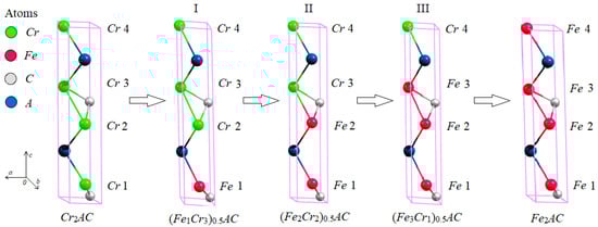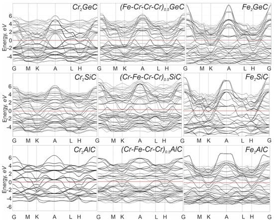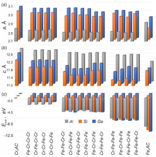 - Tomilin, F.N.; Shubin, A.A.; Kozak, V.V.; Ivanova, D.A.; Fedorova, N.A.; Ol’shevskaya, Y.S.; Kovaleva, A.V.; Avramov, P.V.; Ovchinnikov, S.G. Effect of Substitution on Magnetic Moments of Iron and Chromium Atoms in MAX Phases of Type (Cr4–xFex)0.5SiC: Theoretical Calculation. Phys. Met. Metallogr. 2022, 123, 640–644. [Google Scholar] [CrossRef]