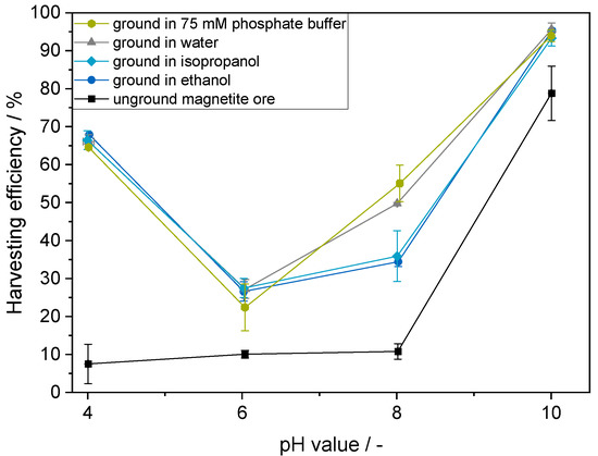 Harvesting efficiency over grinding time at different pH values. The original EX009 magnetite ore was ground in the agitator bead mill (LabStar, Netzsch Feinmahltechnik GmbH) for 390 min.