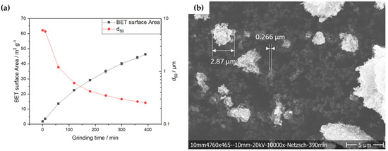 (a) Particle size and BET surface area during grinding of magnetite ore in an agitator bead mill (LabStar Zeta, Netzsch Feinmahltechnik GmbH); (b) SEM picture of MNOs produced after 390 min grinding in an agitator bead mill.