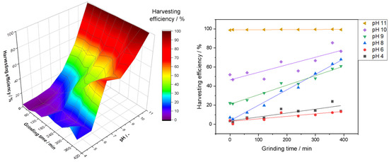 For the harvesting efficiencies, we found increasing values for the higher available surface and increasing pH (Figure 6). Again, the high harvesting efficiency at alkaline pH is due to the precipitation of medium components leading to flocculation. More interesting is what happens at slightly alkaline pH values: the increase in harvesting efficiency at pH 8 is much steeper than the other values. This is contradictory, as the magnetite surface starts being negatively charged at this pH, and the algae are clearly negatively charged (Figure 4). We think there is a sweet spot between the particle size and pH, where neither the particle charge nor flocculation plays the dominant role. We also observed this discrepancy in the harvesting efficiency in our planetary ball mill trials at pH 8, and the difference between organic and aqueous solvent milling. Therefore, the previously described hydroxide forming when grinding in aqueous media might also cause the difference in the harvesting efficiency [44,45]. At pH 9 and higher, the beginning precipitation of calcium phosphate and magnesium hydroxide increases the harvesting efficiency by flocculation [37].