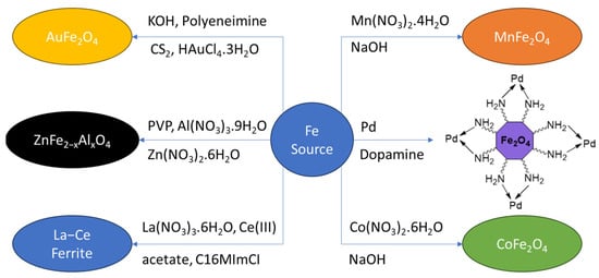 - Amiri, M.; Eskandari, K.; Salavati-Niasari, M. Magnetically Retrievable Ferrite Nanoparticles in the Catalysis Application. Adv. Colloid. Interface Sci. 2019, 271, 101982. [Google Scholar] [CrossRef]