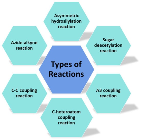 | Sonogashira cross-coupling reactions | Catalyst highly active and reusable up to tenth run Reduced reaction time | [118,119,120,121] | |