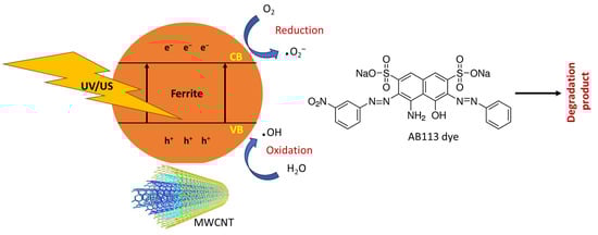 | Sonophotocatalytic degradation process of the Acid Blue 113 (AB113) dye | Catalyst showed exceptional efficiency of dye removal (100%), total organic carbon (93%), and chemical oxygen demand (95%) | [104] | |