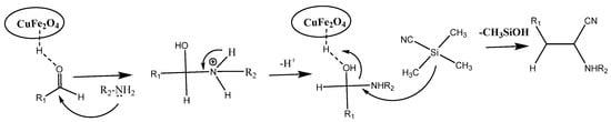 - Cahyana, A.H.; Liandi, A.R.; Yulizar, Y.; Romdoni, Y.; Wendari, T.P. Green Synthesis of CuFe2O4 Nanoparticles Mediated by Morus alba L. Leaf Extract: Crystal Structure, Grain Morphology, Particle Size, Magnetic and Catalytic Properties in Mannich Reaction. Ceram. Int. 2021, 47, 21373–21380. [Google Scholar] [CrossRef]