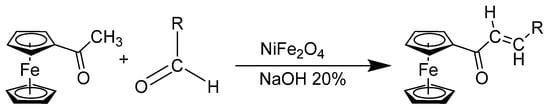 | Claisen–Schmidt condensation | Excellent yield of acetylferrocene chalcones More electronegative and conjugated phenyl groups yielded better products with reduced time | [123] | |
