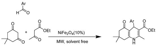 - Qiao, S.; Zhang, N.; Wu, H.; Hanas, M. Based on MFe2O4 NPs Catalyzed Multicomponent Reactions: Green and Efficient Strategy in Synthesis of Heterocycles. Synth. Commun. 2021, 51, 2873–2891. [Google Scholar] [CrossRef]