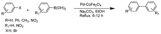 | Synthesis of biaryls from arylboronic acid | Catalyst recovered and reused up to five cycles 83–96% yield | [95] | |