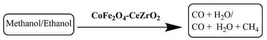 | Zinc ferrite ZnFe2O4 | Conversion of methanol to CO and H2 | Reaction temperature decreased Transformation of ferrite phase | [106] |