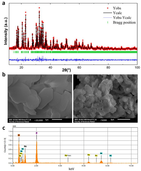 The scanning electron microscopy (SEM) micrographs of the polycrystalline sample reveal the presence of irregularly formed particles with micrometer-scale sizes (Figure 3b). The energy-dispersive X-ray spectroscopy (EDS) analysis confirms that the powder exhibits a homogeneous dispersal with the presence of Na, Ni, Fe, P and O atoms only. Moreover, the atomic ratio of these elements closely aligned with the desired composition, as evidenced by the Na/Fe, Ni/Fe and P/Fe ratios of 7.01, 3.09 and 7.99, respectively (Figure 3c).