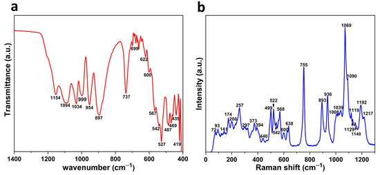 The FT-IR and Raman vibrational spectra of the studied phosphate are illustrated in Figure 4. The vibration of the [P2O7]4− moieties can be viewed as a combination of P–O, P–O–P, and O–P–O vibrations. For the infrared spectrum, the bands observed at high frequencies, specifically 1154 cm−1 and 1094 cm−1, can be ascribed to the P–O asymmetric stretching vibrations (υas), whereas the band located at 1034 cm−1 can be attributed to the P–O symmetric stretching vibrations (υs) within the PO3 groups of the diphosphate units. Additionally, the bands located between 999 and 897 cm−1 are related to the asymmetric stretching vibration (υas) of P–O–P, while the one seen at 737 cm−1 is attributed to the symmetric stretching vibration (υs) of P–O–P bridges. Moreover, the absorption peaks in the range of 600–699 cm−1 correspond to the asymmetric bending vibration (δas) of O–P–O, whereas the low bands at less than 600 cm−1 could be ascribed to O–P–O symmetric bending mode (δs). All the suggested assignments for the vibrational modes of P2O7 groups are consistent with those of pyrophosphates reported previously [37,38,39].