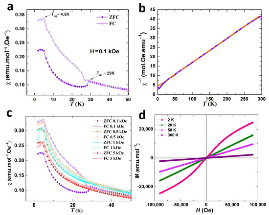The resulting magnetic susceptibility (χ = M/H) in a magnetic field of 0.1 kOe is illustrated in Figure 5a. The inverse magnetic susceptibility χ−1(T) is presented in Figure 5b.