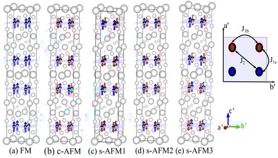 We determined in-plane nearest-neighbor (NN) interaction (J, J), in-plane next-nearest-neighbor (NNN) interaction (J) and nearest-neighbor interaction along the c-axis (J and J) using the difference of total energies obtained in various spin configurations of Fe sub-lattices. Different spin interactions existing in magnetic structure J, J, J, J and J are distinct according to the physical distances between magnetic centers and their neighboring magnetic centers. In order to calculate the four exchange parameters J, J, J, J and J, we performed spin polarized DFT calculations on six different magnetic unit cells, each having distinctly ordered collinear Fe spin configurations. Exchange interactions J, J and J are defined in Figure 1. J and J are the exchange parameters along the z-direction interaction in alternate layers corresponding to a distance d and d, respectively. In order to calculate the exchange parameters, we employed the following Heisenberg Hamiltonian