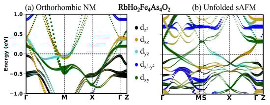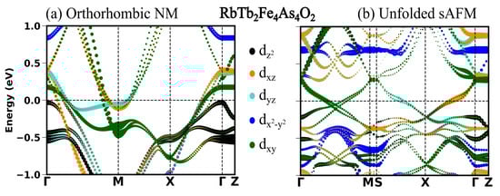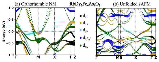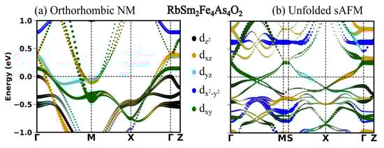 In the previous section, we see in all the four compounds that the sAFM emerges as the most stable configuration in both unit cells obtained before and after the optimization. After the full optimization, the obtained sAFM orthorhombic structural phase is the most stable one, with energy per atom 0.5 meV less than that of tetragonal unit cell. In this section, we highlight the significant influence of stripe antiferromagnetic (AFM) order on the observed variations in the low energy electronic structure. In Figure 2, Figure 3, Figure 4 and Figure 5, the electronic structure enforcing the non-magnetic solution is compared with that of introducing the sAFM order in RE = Sm, Tb, Dy and Ho 12442 compounds, respectively. Non-magnetic orthorhombic calculations result in a band structure typical of hybrid 12442 compounds in Figure 2a, where multiple bands with multi-orbital characteristics cross the Fermi level (Fl) at around the and M-point. However, the orbital characteristics of bands with mixed d/d are now separated due to the orthorhombic structure. In Figure 2a, there are six hole pockets near the -point in the orthorhombic NM phase. Back-folding the four electron bands at the M-point, one might expect a total of ten bands at around the Gamma point in the AFM phase; however, only four bands are crossing the Fermi level (Fl) along the -M. The effect of the AFM ordering is severe, such that none of the bands of the orthorhombic NM phase in Figure 2a, Figure 3a, Figure 4a and Figure 5a are recognizable to bands of the sAFM phase in Figure 2b, Figure 3b, Figure 4b and Figure 5b. In the ground-state s-AFM unit cell, the electron bands at the zone corner M-points are expected to be mapped back to the -point, thus hybridizing strongly with the hole bands at around the -point. Bands crossing the Fl in Figure 2b have dominant d, d and d characteristics. Around the center of the high-symmetry axis -M, four bands cross the Fl. These four bands cross each other at around the center of symmetry axis. In Appendix A.3 Figure A1, there are two bands crossing the Fl along the high-symmetry line -M. The number of bands crossing the Fl in Figure 2b is doubled due to unfolding with slight asymmetric dispersion around the symmetry axis. Surely, backfolding the NM band structure in Figure 2a, one can not obtain the sAFM band structure in Figure 2b; hence, sAFM of RE12442 is not weak coupling SDW. It was shown earlier in the spin density wave state of FeSCs that hybridization of certain bands at exactly the high-symmetry points is forbidden with the nodal nature of SDW state; this leads to the formation of a Dirac-like dispersion localized at the high-symmetry axis [,]. The magnetic order completely reconstructs the band structure, and dispersion along all the paths changes considerably. The low-energy electronic structure is altered with a complete change in number of bands crossing the Fl as well as their orbital characteristics and dispersion.