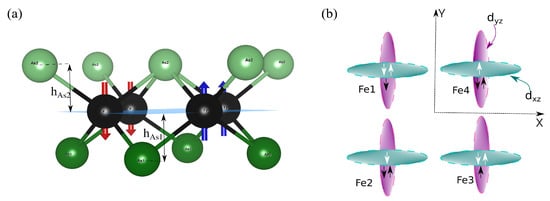 (a) A side view of Fe-As layer, where Fe and As atoms are shown with black and green colors, respectively. Red and blue arrows indicate down- and upspin, respectively. A typical stripe spin antiferromagnetic (s-AFM) configuration is shown, where the Fe spins are aligned ferromagnetically along the x-direction and antiferromagnetically along the y-direction. (b) Schematic presentation of ferro-orbital ordering of iron atoms in s-AFM configuration, which is a favorable ordering in iron pnictides due to kinetic energy gain from the nearest-neighbor hopping [].