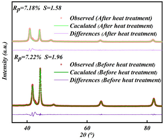 The X-ray diffraction (XRD) patterns of Fe-Si/SiO2 SMCs, before and after heat treatment at 923 K, are presented in Figure 3. Three diffraction peaks can be observed at 44.32°, 64.75°, and 82.36°, which correspond to the (110), (200), and (211) planes, respectively, of the body-centered cubic structure’s -Fe(Si) (COD 96-900-6622) phase. The crystal’s space group is Im3m (229) and exhibits characteristic peaks at 41.79° and 48.76°, indicating the presence of the SiO2 phase (COD 96-901-2604). The XRD experimental results were refined using Rietveld refinement to estimate potential phase changes in the Fe-Si/SiO2 SMCs. The Rietveld calculations were found to be consistent with the experimental results based on the low values of Rp (peak residual variance factor), which were 7.22 before heat treatment and 7.18 after heat treatment, and S (goodness of fit), which were 1.96 before heat treatment and 1.58 after heat treatment. Meanwhile, the unit cell parameters before and after heat treatment were almost unchanged (for α-Fe (Si)—a = b = c = 2.849, α = β = γ = 90°; for SiO2—a = b = 4.625, c = 5.216, α = β = 90°, γ = 120°). This indicates that the heat treatment had a slight to no effect on the Fe-Si/SiO2 SMCs’ internal structure.