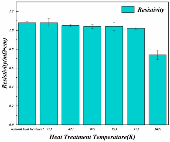 Resistivity, which is inversely proportional to conductivity, is a useful parameter for characterizing the electrical conduction of metal composites. The presence of defects in conduction electrons acts as scattering centers, and reducing these defects can lead to a decrease in resistivity [18] as the heat-treatment temperature increases. The disappearance of pores generated during the molding process also contributes to this trend [7]. Even though the SiO2 insulating layers become more complete and uniform on the surface of the Fe–Si particles as the internal stress decreases, as shown in Figure 5, the resistivity still slightly decreases within the 823–973 K range for the heat treatment. Moreover, the downward trend may be impacted by the increased grain size of the Fe-Si/SiO2 SMCs with higher heat-treatment temperatures while the density of the grain boundary with the higher resistivity decreases [19]. As the temperature of the heat treatment increased, the Fe-Si particles underwent deformation and the SiO2 particles were dispersed throughout the material rather than being confined to the surface of the particles. This dispersion occurred due to damage to the core–shell structure and the prevention of the initial separation of the Fe-Si particles [20]. As a result, the resistivity of the material was significantly reduced.