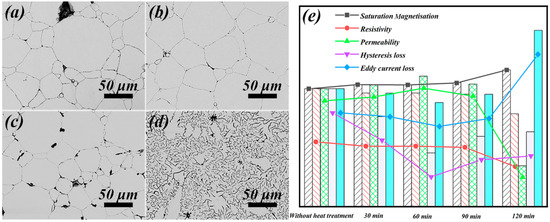 Backscattered electron images of the polished surfaces of the SMCs heat-treated at different times: (a) 30 min, (b) 60 min, (c) 90 min, (d) 120 min, and magnetic properties (e) of the SMCs heat-treated at different times.