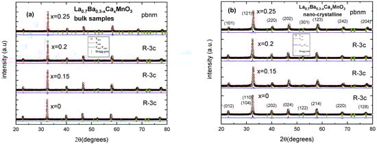 X-ray diffraction patterns and Rietveld refinement results for (a) La0.7Ba0.3−xCaxMnO3 polycrystalline bulk samples and (b) La0.7Ba0.3−xCaxMnO3 nano-sized samples.