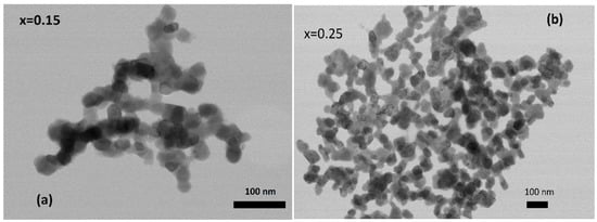 Selected TEM pictures for La0.7Ba0.3−xCaxMnO3 nano-sized samples for x = 0.15 (a), x = 0.25 (b).