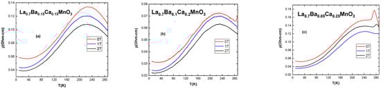 Figure 4 shows graphs of the samples with Ca substitution, and it can be observed that all three plots exhibit a peak at Tp1 at about 226–230 K. This value, being far away from Tc for all samples, can be attributed to grain boundary conditions [21,22,23], where substitution of smaller Ca ions results in increased disorder, which tends to shift toward the boundaries in order to conserve energy [24,25]. According to previous works [26,27], the parent compound does not exhibit such a peak; hence, it can be concluded that the effect is mainly the result of substitution. Additionally, there is another peak at Tp2 for the sample with x = 0.25, most pronounced at 0 T. It becomes smaller at 1 T and almost disappears at 2 T. This peak should be attributed to the ferromagnetic–paramagnetic transition at Tc. The sample with x = 0.2 exhibits an increase in resistivity at about 280 K for 0 T, but the peak resides beyond the experiment’s temperature range.