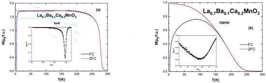 Ferromagnetic–paramagnetic transition was observed in all samples by studying their magnetization behavior in an external field of 0.05 T in the temperature range of 4–360 K. Plots of selected zero-field cooled/field cooled (ZFC–FC) data are presented in Figure 5. Tc was estimated by taking a derivative of magnetization vs. temperature, with the inflection point representing Tc, as shown in the insets of the graphs.