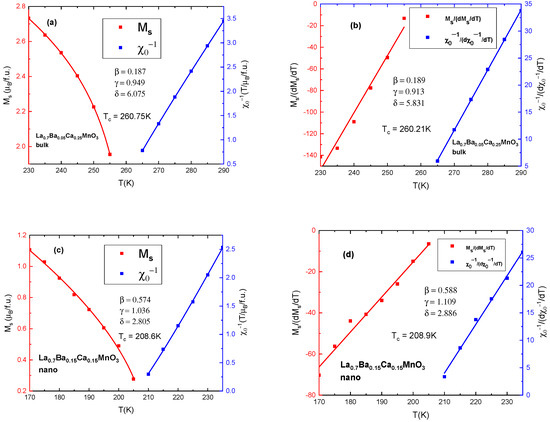 Calculated values for critical exponents for (a) MAP for the bulk sample with x = 0.25 and (b) KF for the bulk sample with x = 0.25. (c) MAP for the nanocrystalline sample x = 0.15; (d) KF for the nanocrystalline sample x = 0.15.