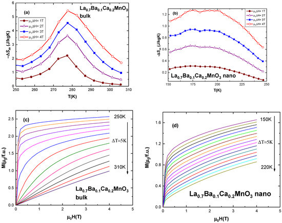 Magnetic entropy change vs. temperature for selected samples: (a) x = 0.2 bulk, and (b) x = 0.2 nanocrystalline sample. Isothermal magnetization curves at fixed temperature intervals for (c) x = 0.2 bulk and (d) x = 0.2 nanocrystalline samples.