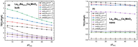 Initial observation reveals that the value for TEC for all polycrystalline samples diminishes with increasing temperature span ΔTH-C. This tendency has been reported in previous research [51,52,53] and is expected, as the graphs for magnetic entropy change in bulk have a smooth Gaussian-like distribution. Nano-sized samples, on the other hand, show a small fluctuation around a mean value, which also diminishes, but very slowly, with increasing ΔTH-C. This is explained by the existence of local minima and maxima on the magnetic entropy change graphs. At a second glance, another observation can be made: increasing levels of substitution by Ca ions cause an increase in TEC in polycrystalline samples. The opposite effect is seen for nanocrystalline samples, as seen in Figure 10b; they tend to decrease their value of TEC with increasing substitution due to lowering values of entropy change.