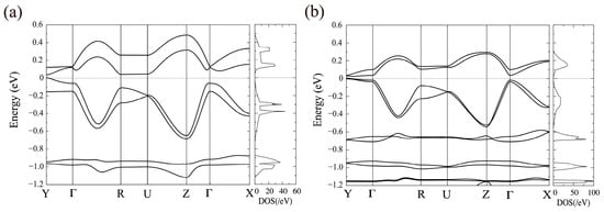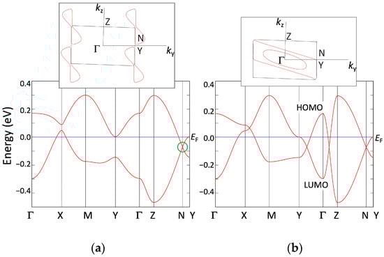 Figure 7 indicates the DFT band structure of [Ni(tmdt)2] calculated with the GGA-PBE functional. In the kx = 0 plane, due to the space inversion symmetry, a pair of Dirac points exists at (kx, ky, kz) = (0, 0.685, 0.265) and (0, 0.315, −0.265). The Dirac point is located 65 meV lower than the Fermi level. The tight-binding band structure in Figure 3a is generally in agreement with the DFT band structure, e.g., hall-like characteristics near the X point and electron-like characteristics near the N point.
