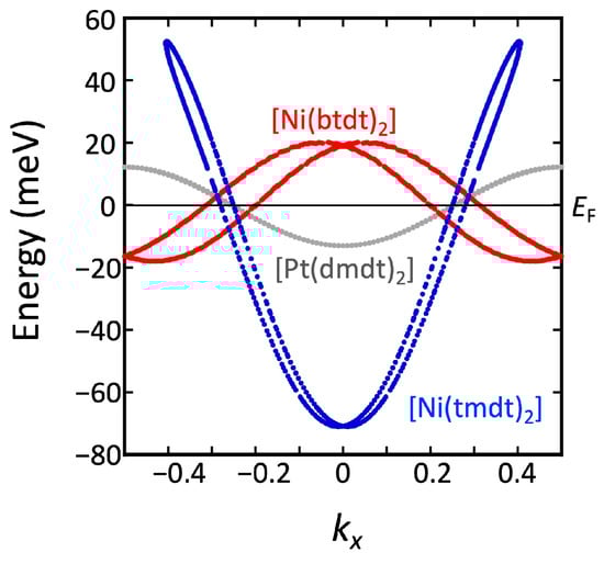 - Rovira, C.; Novoa, J.J.; Mozos, J.-L.; Ordejon, P.; Canadell, E. First-principles study of the neutral molecular metal Ni(tmdt)2. Phys. Rev. B 2002, 65, 081104. [Google Scholar] [CrossRef]