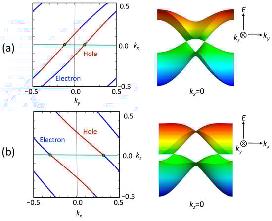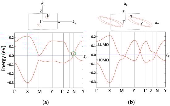 Equation (11) represents the HOMO–LUMO band crossing, and Equation (12) indicates a node of the HOMO–LUMO coupling. When the HOMO–LUMO coupling hH-L is set to zero, the HOMO and LUMO bands intersect, resulting in a large Fermi surface as shown in Figure 3b and Figure 9b. Notably, the energy at the intersection is situated near the Fermi level, because the HOMO is fully occupied and the LUMO is entirely empty in the isolated molecule state. Figure 14 illustrates that the intersection forms a (green) loop on the ky-kz plane (kx = 0) for [Ni(tmdt)2] and [Ni(btdt)2]. In real systems, however, the HOMO–LUMO coupling induces band hybridization and maintains a gap between the two bands, known as band repulsion. An exception occurs at the node of the HOMO–LUMO coupling. In Figure 14, the node (hH-L = 0) is represented by the orange line, and the intersection point with the green loop gives the Dirac point where Equations (11) and (12) are satisfied.