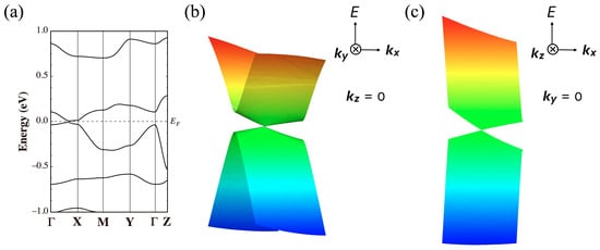 Figure 13a illustrates the band structure for the new unit cell of the optimized structure. The Dirac points are located at specific points in k-space, represented by the coordinates (kx, ky, kz) = (±0.3120, 0.014, 0). Figure 13b and Figure 13c depict the Dirac cones observed in the kx-ky and kx-kz planes, respectively. It should be added that the tight-binding band calculation based on the DFT-optimized structure also indicates the presence of Dirac cones at (kx, ky, kz) = (±0.414, 0, 0.004).