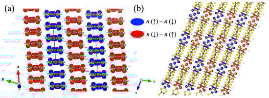 Next, we discuss the AFM pattern of spin ordering. Figure 18 illustrates the spin densities in the AFM state of [Ni(btdt)2]. As shown in Figure 18a, the spins alternate in a pattern along the b axis of the magnetic unit cell. The spin densities are mainly localized on the four S atoms closest to the Ni atom, as depicted in Figure 18b. The presence of the dxz orbital of the Ni atom indicates that the LUMO of the [Ni(btdt)2] molecule contributes to the spin densities (see supporting materials of Ref. []). We note that these spin density and DOS analyses have been widely used in various other studies that describe the electronic structure of materials [,].