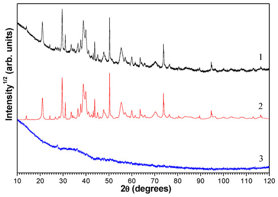 XRD patterns of the fine narrow fraction: 1—experimental, 2—calculated, and 3—difference.