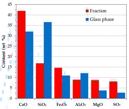 According to the quantitative X-ray diffraction analysis (Table 1), Ca-bearing compounds are the main crystalline phases. The compounds are the following: aluminum-substituted ferrite (Ca4Al2Fe2O10—brownmillerite), tricalcium aluminate (Ca3Al2O6), and calcium sulfate and carbonate; together with calcium hydroxide and oxide, this accounts for 48.5 wt % of the gross composition of the fraction. The other crystalline phases of the dispersed fraction are magnesium oxide (6.8 wt %), Fe-spinel (2 wt %), and quartz (2 wt %) (Table 1). The content of the amorphous Ca-bearing glass phase is 40.7 wt %. As compared to the gross chemical composition, the glass phase is characterized by a higher content of SiO2, as well as Al2O3 (Figure 3).