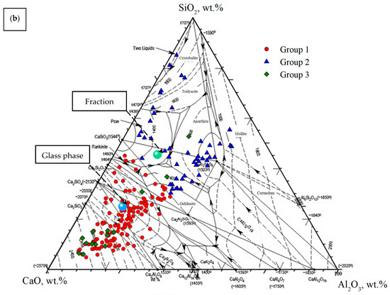 Among the crystalline phases of the narrow fraction annealed at 1200 °C, the wollastonite phase is absent, while the phase of another calcium silicate, Ca2SiO4 larnite (47%), is present in a significant amount. The analysis of both the total chemical composition of the fraction and the composition of the glass phase in the coordinates of the ternary system CaO–SiO2–Al2O3 (Figure 4b) shows that the total composition of the fraction is found in the region of primary crystallization of the wollastonite phase CaSiO3, while the composition of the glass phase is observed in the region of primary crystallization of the larnite phase Ca2SiO4. The compositions of individual microspheres of Group 1 and Group 2, respectively, are localized in the same areas. It can be assumed that the formation of the wollastonite phase is an intermediate stage in the high-temperature formation of such phases as larnite and other calcium silicates/aluminosilicates. Thus, during the synthesis of glass-ceramic samples in the high-temperature region T > 700 °C, the following thermochemical transformations occur in the dispersed microspheres:
