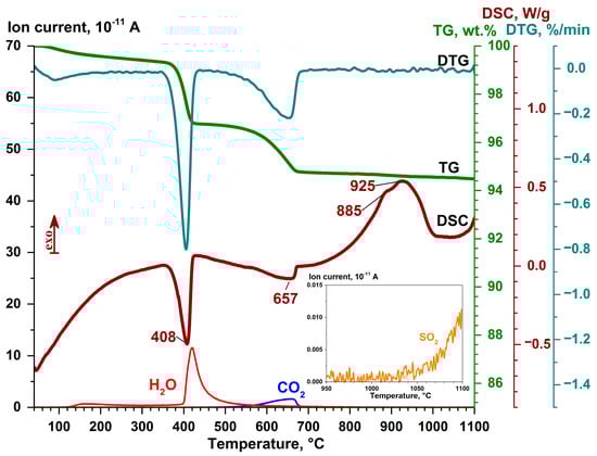 It is difficult to directly synthesize glass-ceramics from fly ash without any additives. The thermochemical transformations observed in the sample of dispersed microspheres upon heating in the temperature range of 40–1100 °C were studied using the DSC-TG method (Figure 5).