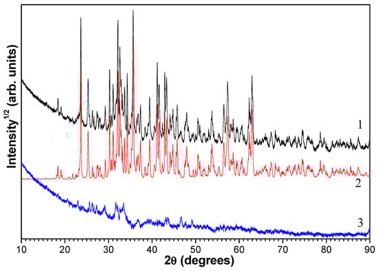 XRD patterns of the fine narrow fraction after heat treatment at 1200 °C: 1—experimental, 2—calculated, and 3—difference.