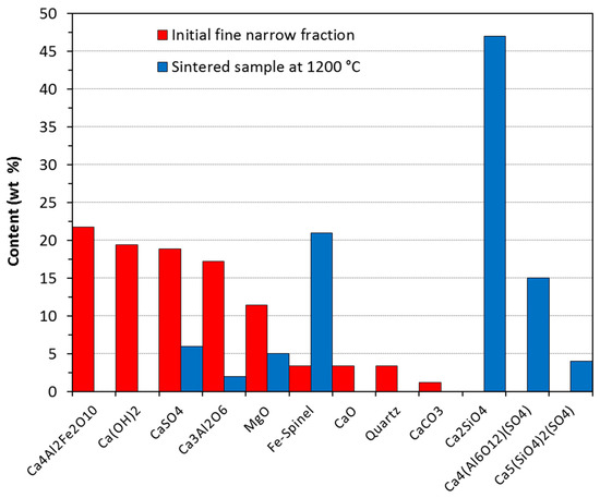The operational characteristics of ceramic materials are largely determined by their mineral-phase composition. The XRD data show that the sintering of the dispersed microspheres at 1200 °C leads to the formation of new crystalline phases (Figure 6 and Figure 7): larnite Ca2SiO4—47%, ye’elimite Ca4(Al6O12)(SO4)—15%, and ternesite Ca5(SiO4)2SO4—4%, where some elements can be replaced by other ones. It also leads to a noticeable increase in the content of Fe-spinel by up to 21%. A decrease in the content of MgO down to 5%, and in those of CaSO4 to 6% and tricalcium aluminate to 2% is observed. Quartz and Ca-containing crystalline phases, such as calcium aluminoferrite, hydroxide, oxide, and carbonate, present in the initial fraction of microspheres were not detected after the heat treatment; the glass phase disappeared almost completely (Figure 2 and Figure 6).
