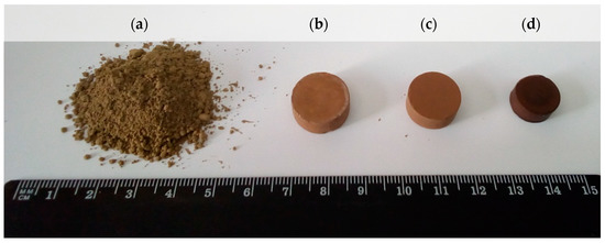 Images of the samples: (a) initial fine narrow fraction 2.5 ± 0.2 g, which was used for sintering; (b) sintered at 1000 °C; (c) sintered at 1100 °C; and (d) sintered at 1200 °C.