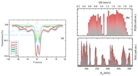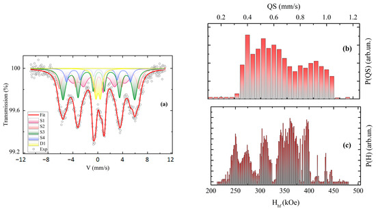 Mössbauer spectrum at 300 K of the initial sample with the partial components marked in the colored areas (a). Quadrupole splitting distribution (b); hyperfine magnetic field distribution in the experimental spectrum (c). The observable extremums were used in the preliminary spectrum in the fitting procedure.