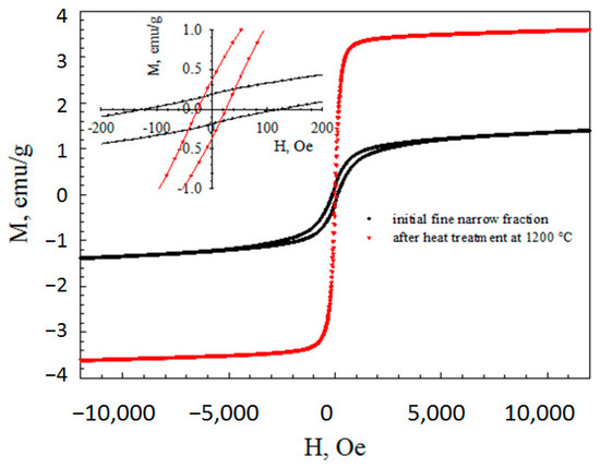 Field dependences of magnetization for initial fly ash fraction and the samples obtained after the sintering at 1200 °C measured at room temperature are shown in Figure 12. It can be seen that the hysteresis curves for these samples are different. The main parameters of the hysteresis loops are listed in Table 5. The sintered sample shows a lower coercivity, HC = 25 Oe, compared to the initial fraction, for which HC = 125 Oe. The HCR value (the magnetic field after which the remanence magnetization value becomes zero) and the HCR/HC ratio also decreased significantly for the sintered sample. The remanence magnetization MR and saturation magnetization MS that were reduced to the mass of the sample, on the contrary, increase after sintering, while the MR/MS ratio decreases. This may be a consequence of a change in the domain state, as well as intergranular interaction during sintering [56,57,58].