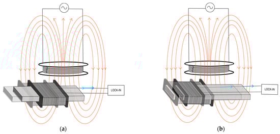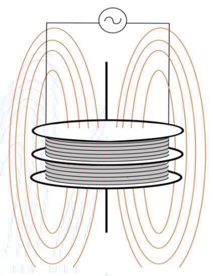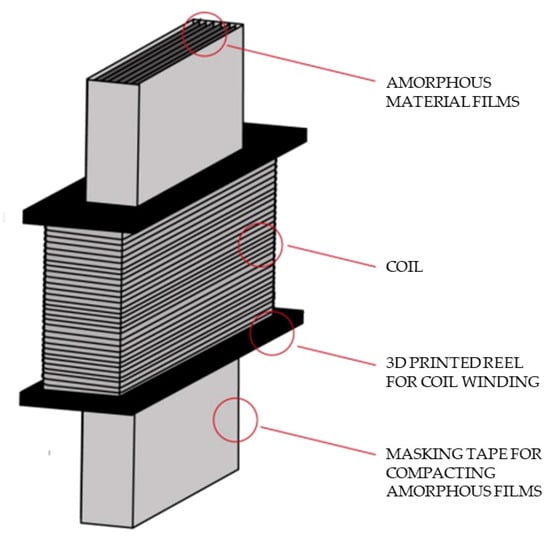It is possible to produce amorphous materials of different geometries, in particular, microwires and thin ribbons. For the experiments conducted in this research, we elected to use ribbons for the amorphous core of the coil instead of other options, such as microwires. The main reason for this decision was rooted in the ease of designing a reel and coil around a rectangular ribbon core as opposed to microwires, given the materials available in our laboratory. Furthermore, using ribbons allowed us to completely fill the core that encapsulates the coil, thereby preventing any air from remaining within the core. In the case of using thin rectangular ribbons of amorphous material, the orientation and thickness of the ribbon is important, as well as the number of ribbons used.