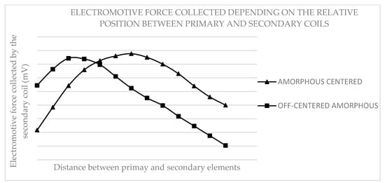 Plotting the expression of the electromotive force collected by the secondary coil as a function of the distance between the primary and secondary systems, for the cases in which the coil is centered with respect to the amorphous core and off-center (at the end of the film), we obtain