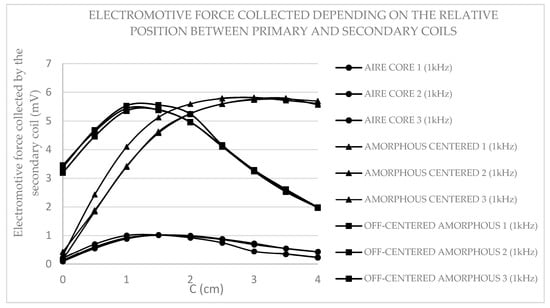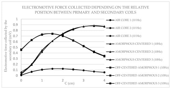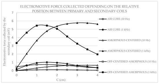 First, the data of the recovered electromotive force were collected for the secondary coil system with an air core. Then, the same test was repeated but adding the amorphous core to the secondary coil. In order to go one step forward and understand better the influence of the amorphous material on the test, two amorphous core systems were defined, which differed in the position of the amorphous material with respect to the coil.